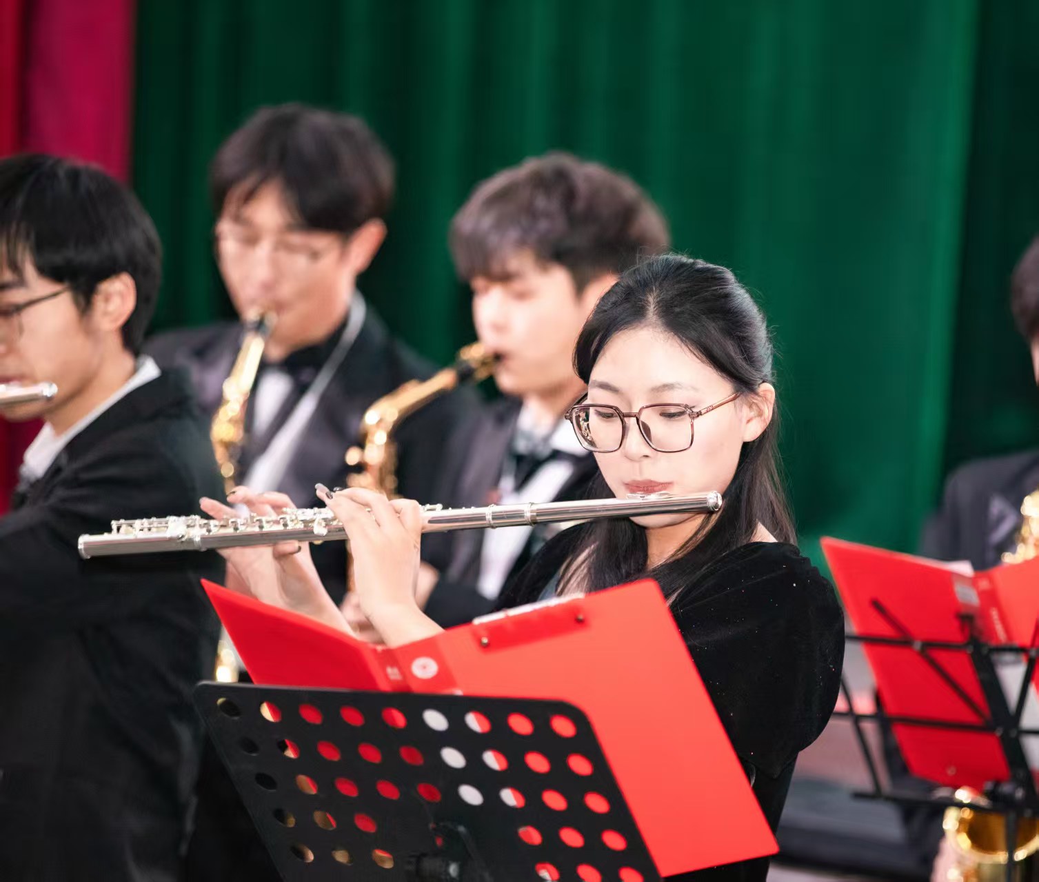 论坛结束后,我校管乐团一首精彩的暖场小曲拉开了“记忆中的那片红”美育汇报演出的序幕,情景表演场《十送红军》、实践类美育课程再现《山丹丹开花红艳艳》、小合唱《追寻》等节目以创新的艺术形式诠释红色文化,生动呈现学校美育课程实践成果,充分展现公共艺术教育中心教师和大学生艺术团与美同行、向美而生的精神风貌。